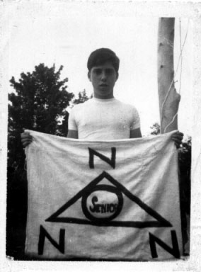 The NOSTALGIA page on this site gives the history of Neg Nord Nud, but it still exists in Jack Pinsky's new camp. Here I am with the flag I made and our own flagpole in the rear.