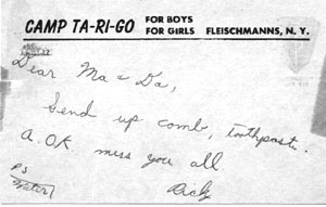 Do these postcards seem familiar? Every day after lunch during rest hour we were supposed to write one card to our parents. This is typical of mine. (OK, But I was 9 years old at the time and wanted to make sure that my parents were watering my plants.)